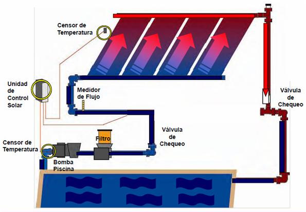 En una instalación solar para climatizar piscinas el sistema de filtración de la piscina bombea el agua a través del colector solar y el calor recogido se transfiere directamente al agua de la piscina.